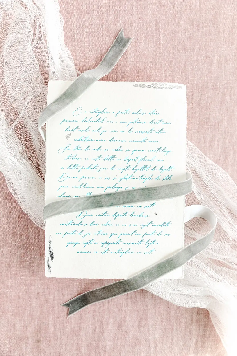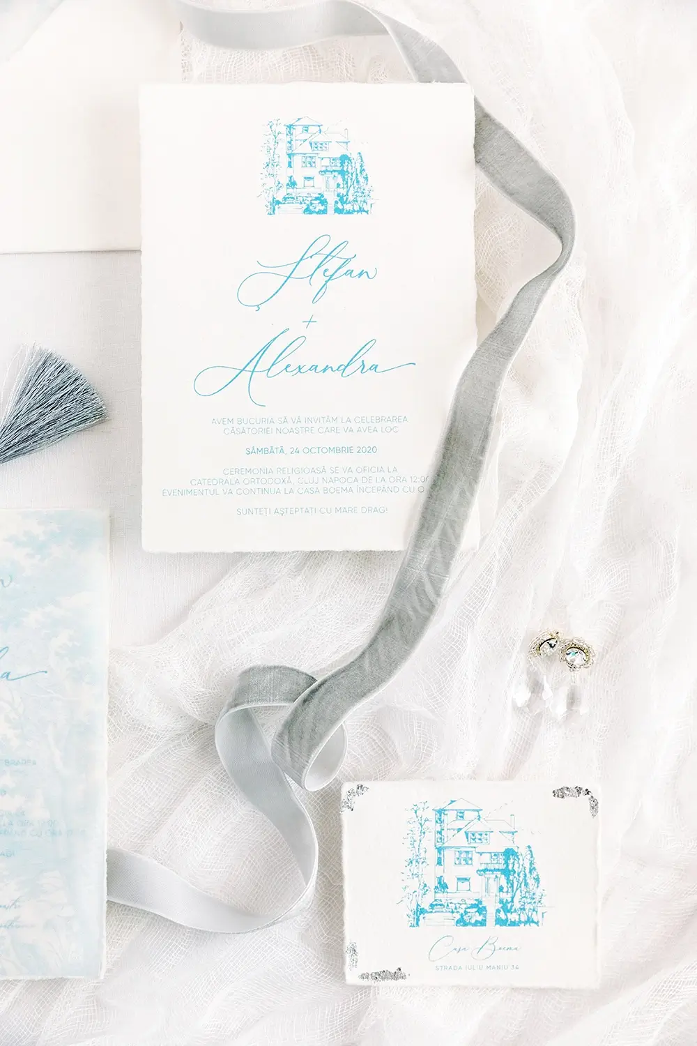 Accentele moderne apar prin fonturile elegante și finisajele spectaculoase: foiță argintie aplicată cu grijă, sigilii de ceară cu inserții florale și o atingere de albastru.
